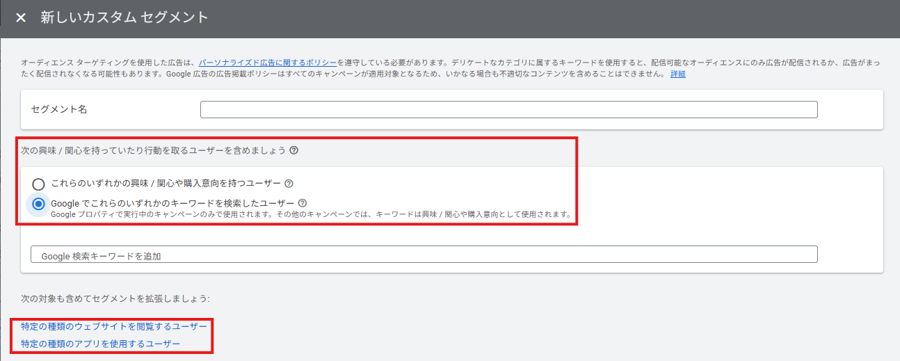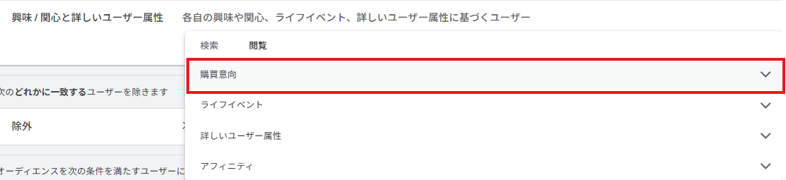 ・指定した語句に関連する商品、サービスについて、行動やアクティビティに基づいて、関心や購入意向が高いユーザーに広告を表示します。