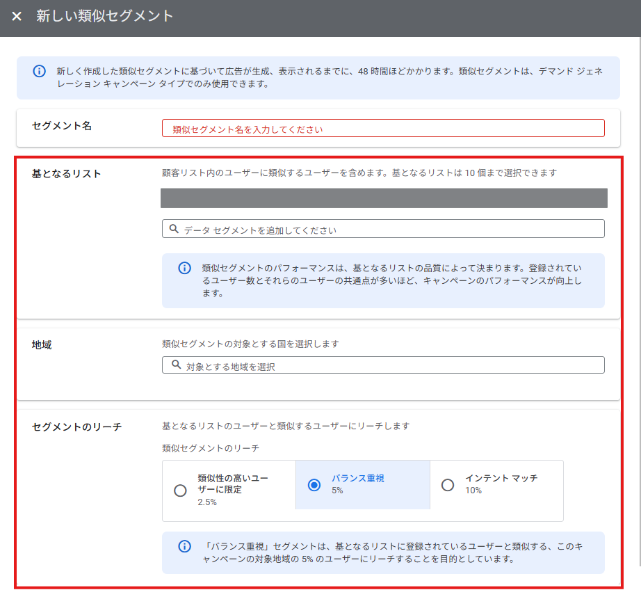 デマンドジェネレーション独自の機能で、「類似」の定義を3パターンに分け、リーチしたいユーザーの数と類似性に応じて選択可能です。