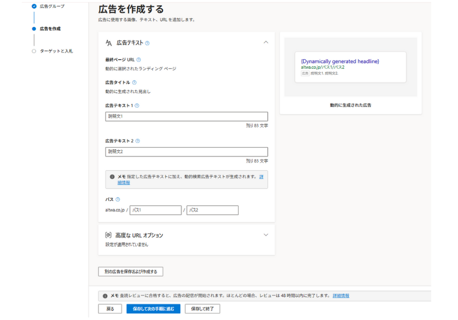 広告の作成画面では広告の説明文とパスを記入します。見出しはWebサイトを読み取って動的に生成してくれるので設定は不要です。