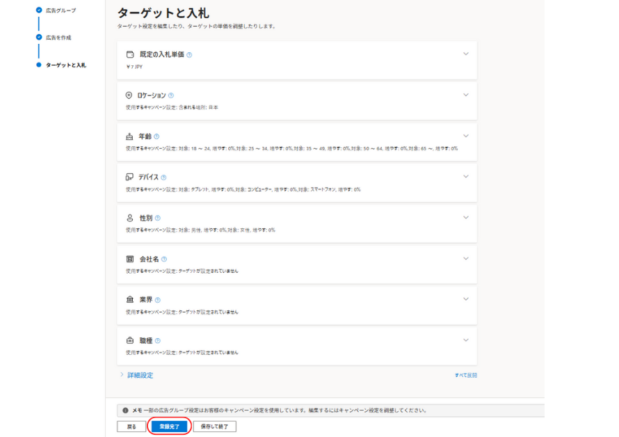 最後にターゲットと入札の設定で詳細なターゲティングを設定し「登録完了」で終了です。