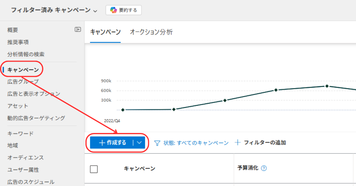 まずはMicrosoft広告の管理画面にログインして、「キャンペーン」→「作成する」を選択します。