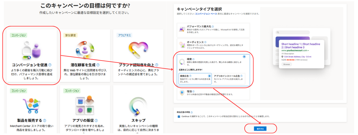 キャンペーン目標を選択し(例:コンバージョンを促進)、キャンペーンタイプで「検索」を選択して、「続行する」を選択します。