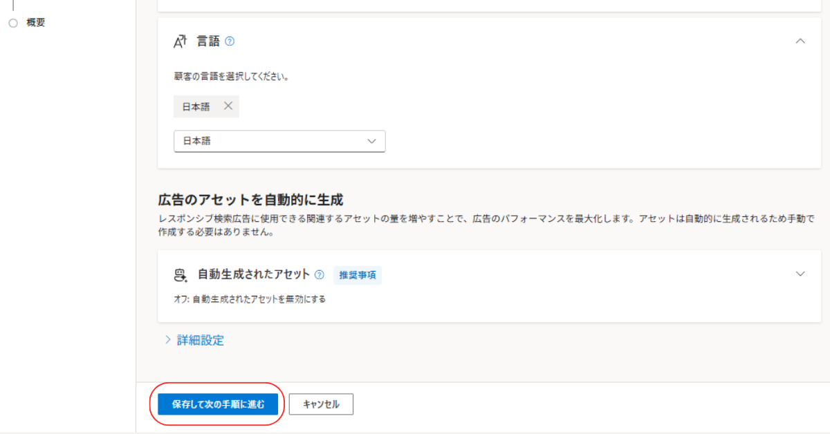 キャンペーン名や地域、言語などの基本設定を行い、「保存して次の手順に進む」を選択します。