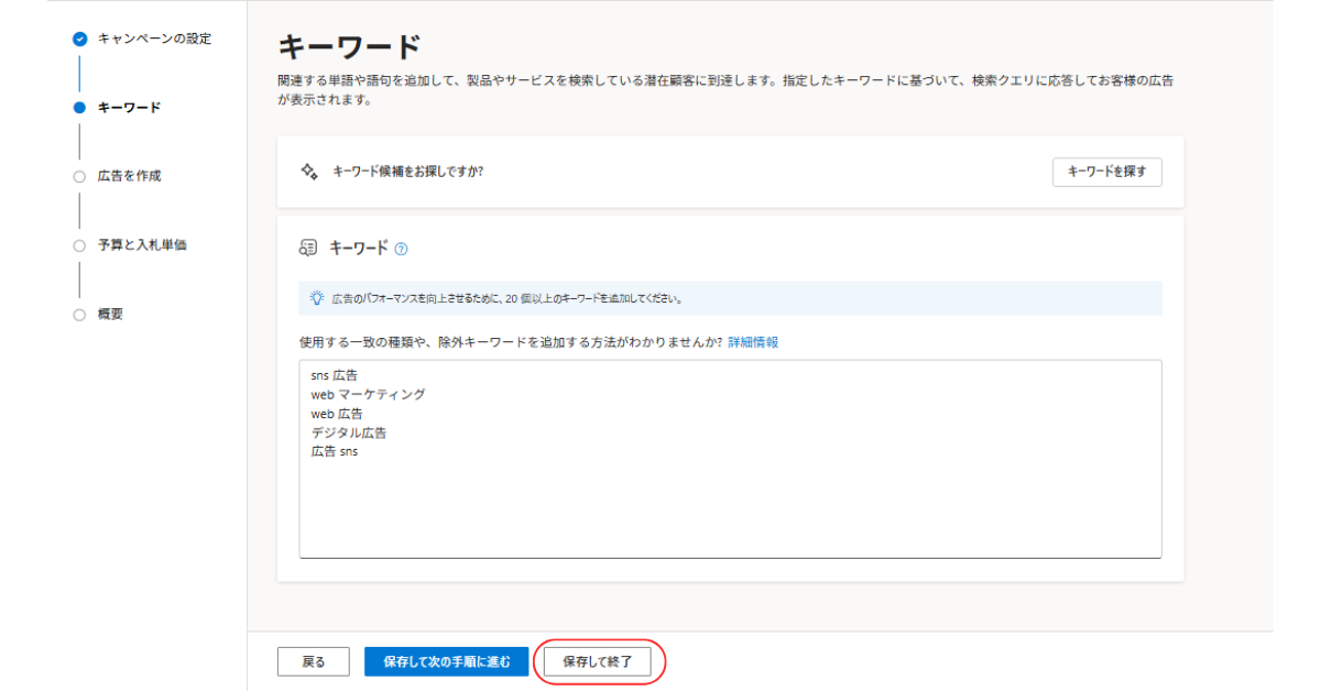 キーワード設定の画面まで来ましたが、DSAはキーワード設定を必要としないので、適当なキーワードをピックアップしてから「保存して終了」を選択し、キャンペーン設定を終了させます。ちなみにキーワードを一つ以上選択しないと、キャンペーン設定の終了ができません。