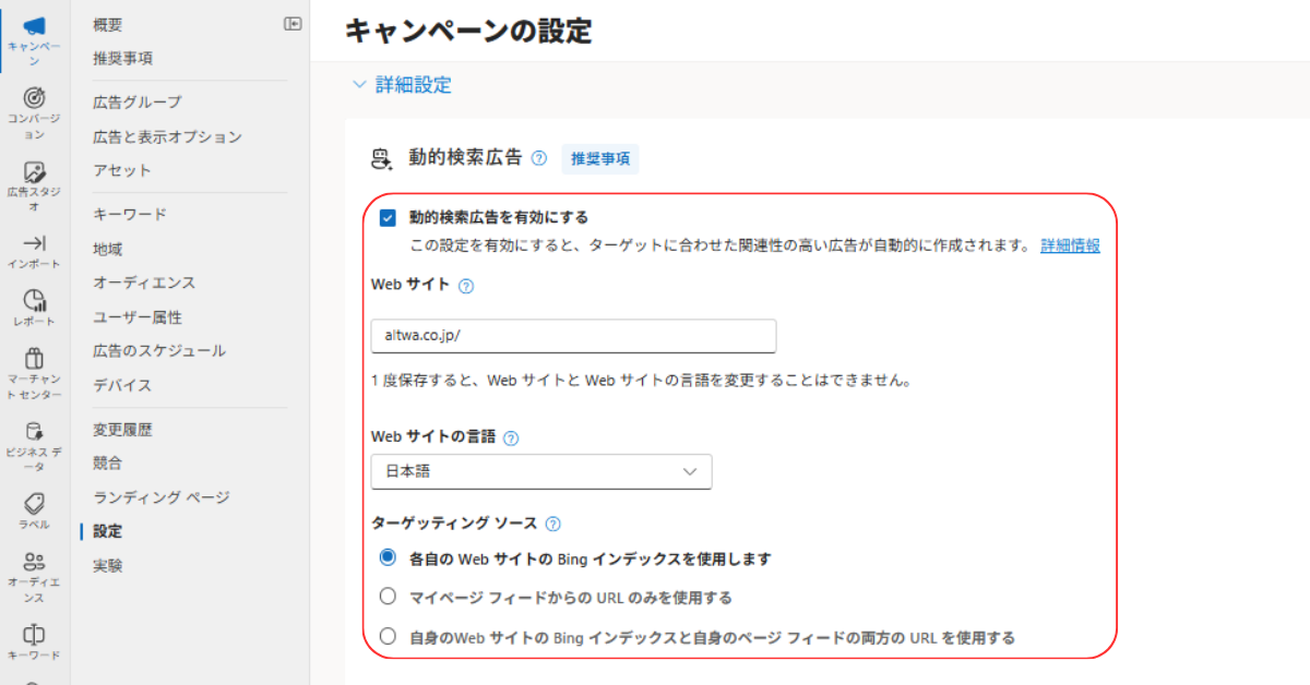さきほど作成したキャンペーンの設定画面を開き、「詳細設定」のタブを開くと動的検索の項目が表示されます。「動的検索広告を有効にする」にチェックを入れ、WebサイトとWebサイトの言語を入力します。ターゲッティングソースは一番上の「各自のWebサイトのBingインデックスを使用します」を選択して保存します。