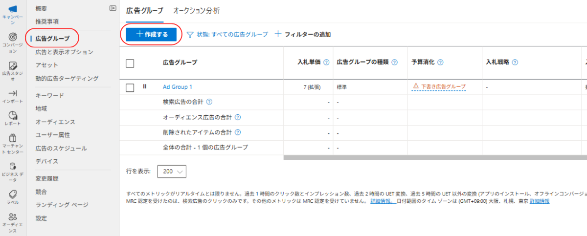 さきほど作成したキャンペーンの広告グループ一覧画面で、「+作成する」を選択して広告グループを作成します。