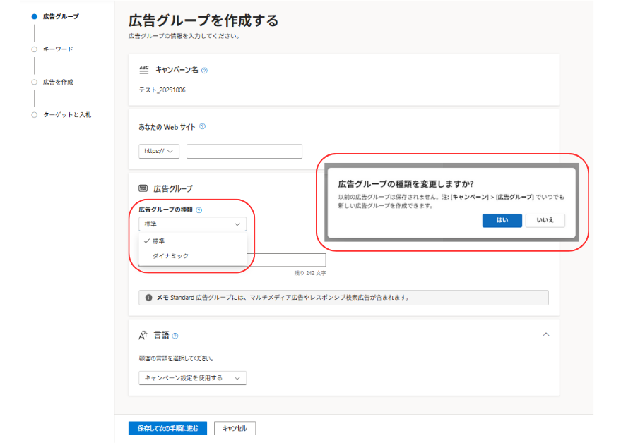 広告グループの種類を「標準」から「ダイナミック」にします。変更時にポップアップが表示されますが、最初に作成した広告グループはキーワードを設定している通常の検索広告用のグループで消えても問題無しなのでそのまま次に進みます。
