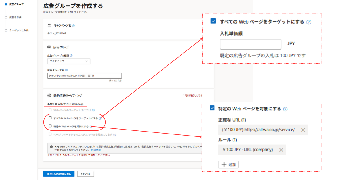 すべてのWebページをターゲットにすると入札価格を入力して保存しましょう。特定のWebページを対象にすると「+追加」から配信するURLを指定できたり、ルールを指定すれば特定のテキストを含むURLのみを指定できたりします。
